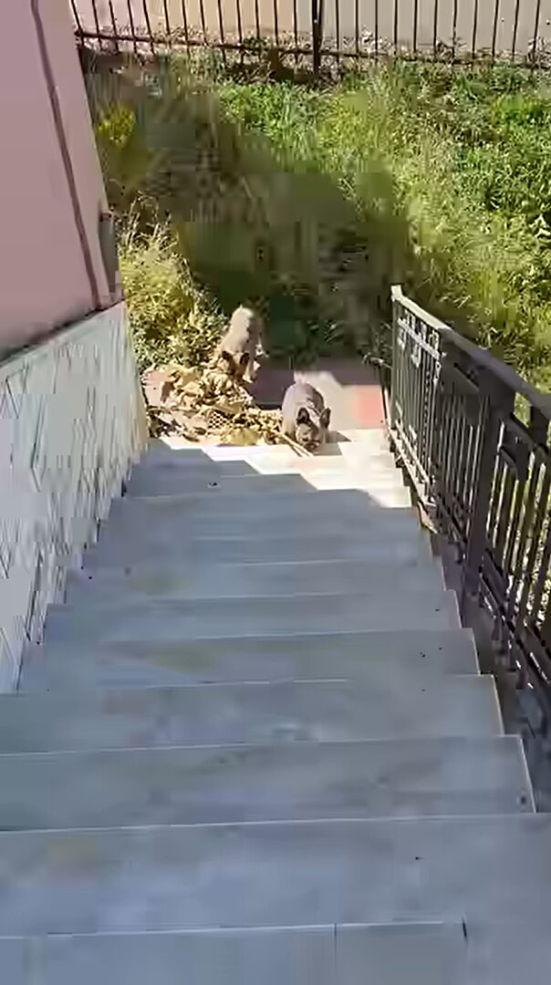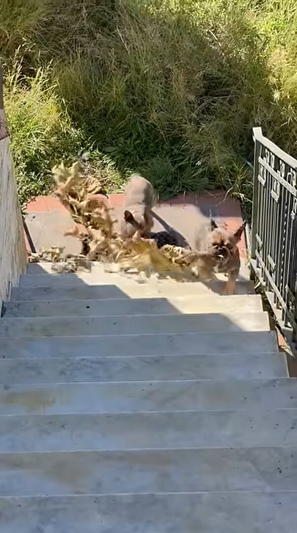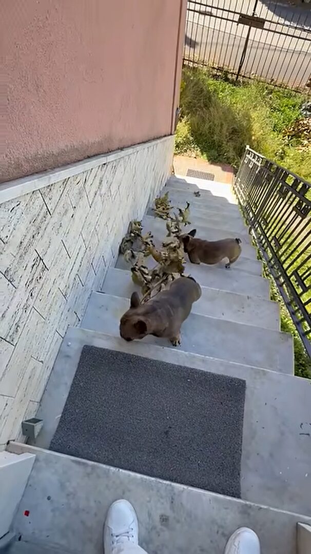 いいモノ見つけた!愛犬たちが長い木の枝をくわえて階段をのぼって来る!!【海外・動画】