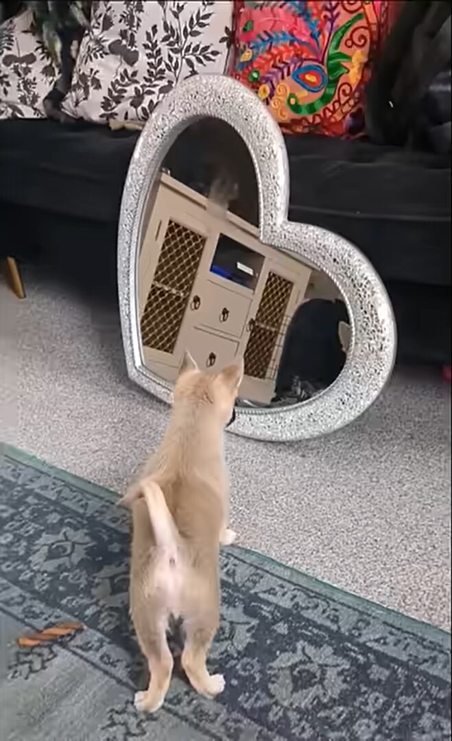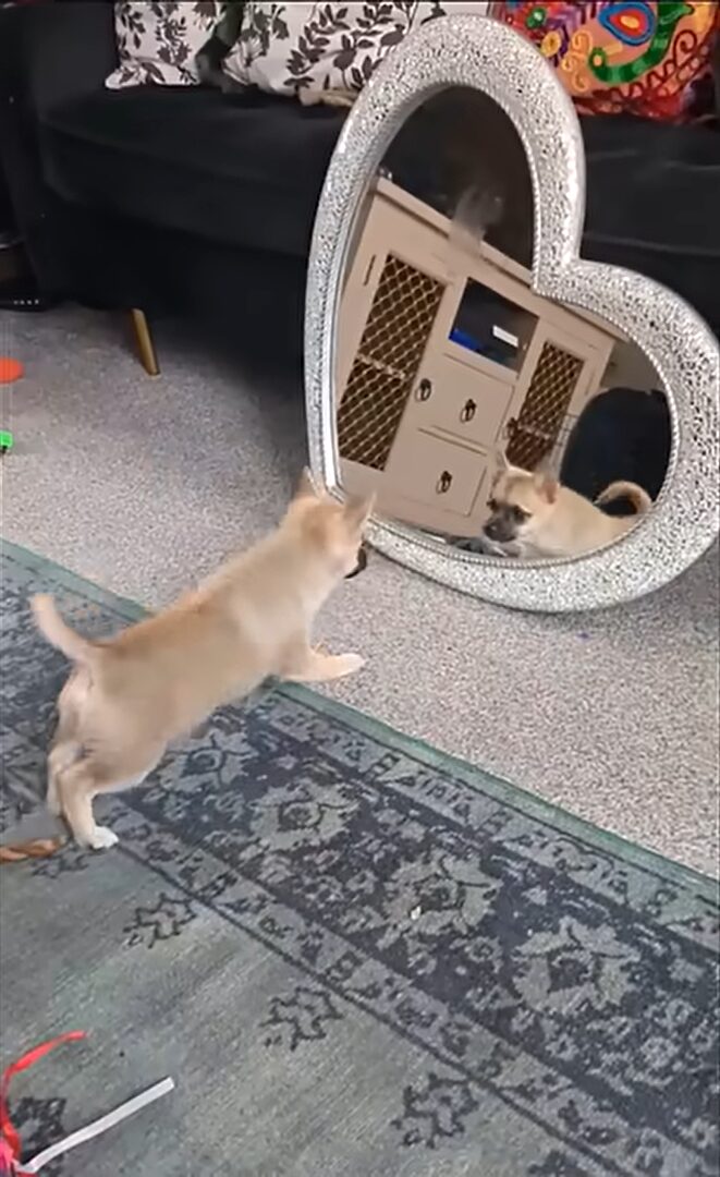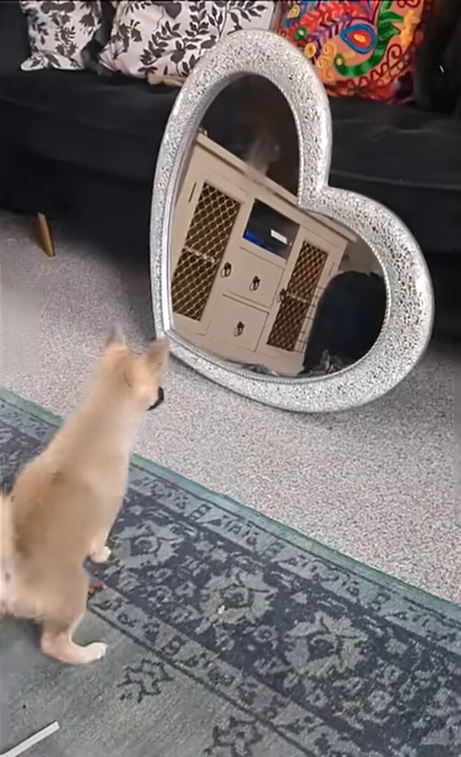 初めて見た自分の姿にビックリ!?子犬が鏡に写る自分に、絶妙な距離を取りながら吠える!【海外・動画】