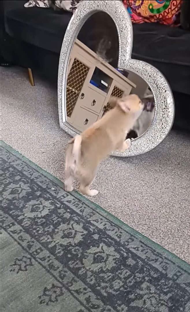 生まれて初めて鏡を見たというこの子は、自分の姿を見るのも初めて。