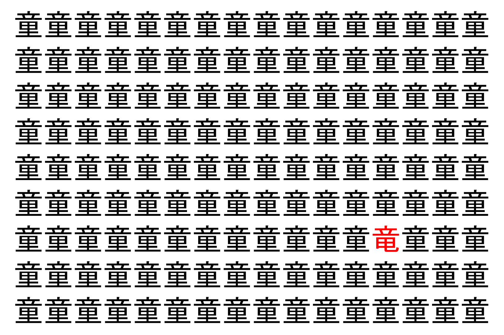 画像の中には、「童」という漢字が縦に9行、横に16個並んでいます。