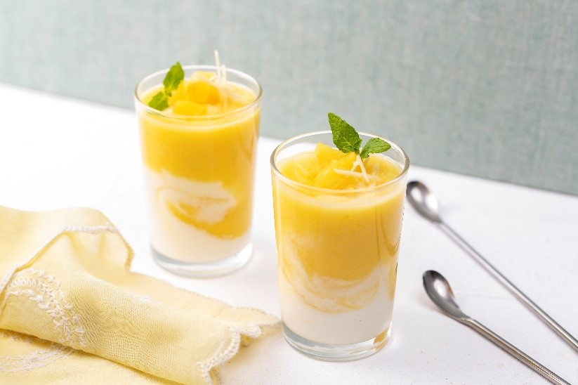 ③ 器にヨーグルトを入れ、2を注ぎ、マーブル模様になる位に軽く混ぜ、飾り用のパイナップル、生姜、ミントを飾る。