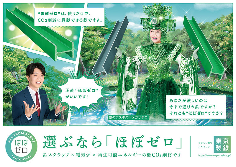 「東京製鐵が促進している低 CO2 鋼材「ほぼゼロ」は、脱炭素社会への切り札となる“鉄のラスボス”であることから、豪華な衣装から“ラスボス”と呼ばれることも多い小林幸子さんを広告に起用しています。