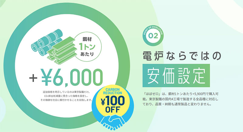 電炉材の特性を生かし、「ほぼゼロ」価格は、鉄鋼製品 1トン当たりプラス 5,900円とリーズナブルな設定になっているのも特長。