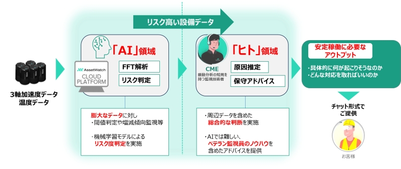 その仕組みは、AIと専門家の知見を融合させた「ハイブリッド型」にあります。IoTセンサーを設備に設置するだけで、AIが24時間体制で稼働状況を把握。さらに、振動解析の高度な知見を持つ専門家「CME(Condition Monitoring Engineer:状態監視技術者)」がデータを精査し、原因分析から具体的な保全アドバイスまでをセットで提示します。