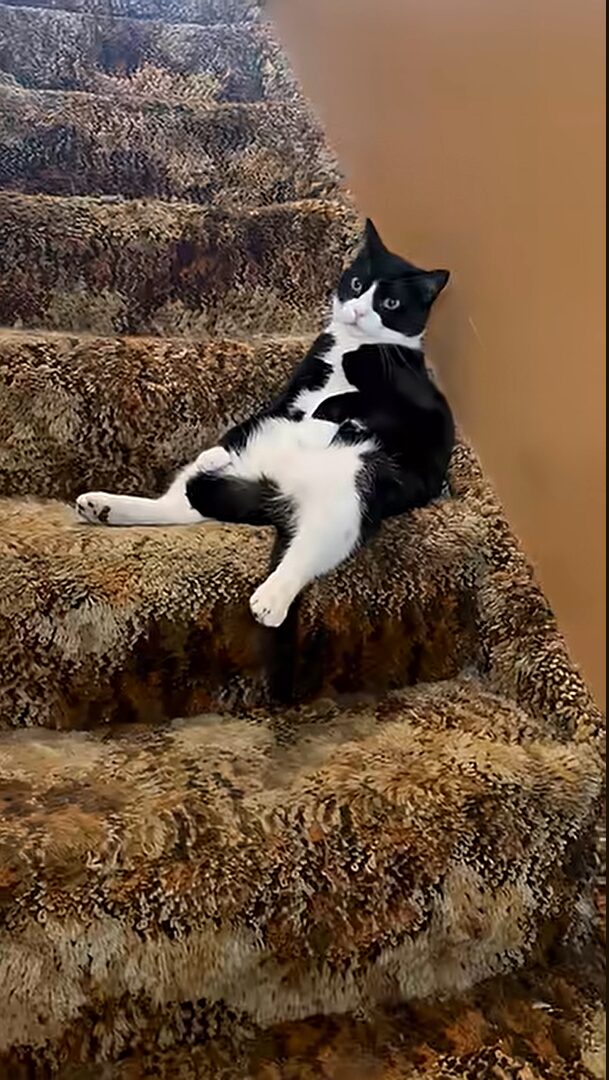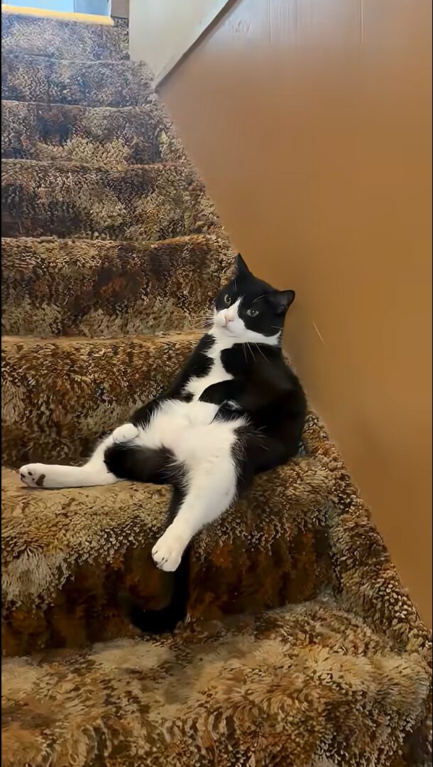 階段に座ってくつろぐネコの姿は、こちらの動画からご覧いただけます。