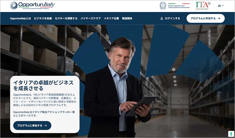 日本を含む世界 20か国・地域の重要市場へ展開し、専用プラットフォーム「opportunitaly.gov.it」上でビジネスマッチングサービスや「メイド・イン・イタリー」(Made in Italy)の戦略的分野に焦点を当てた独自コンテンツを提供中。