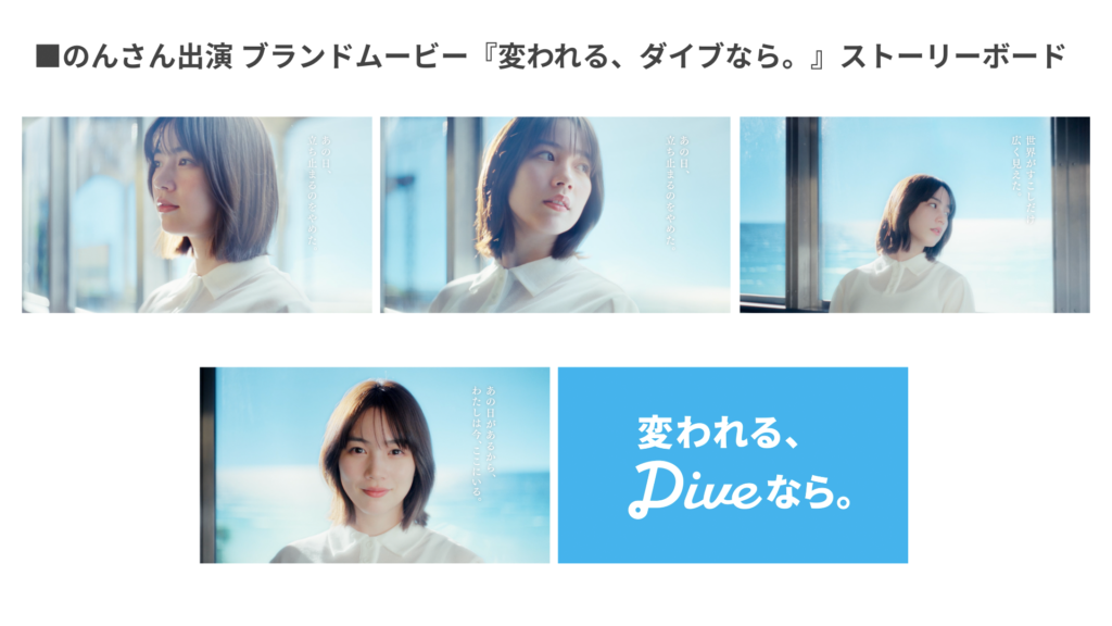 ブランドムービー『変われる、ダイブなら。』では、主人公を演じるのんが、ローカル電車に揺られながら、過去と向き合い、人生の転機となった”あの日”を思い返す姿を描いている。