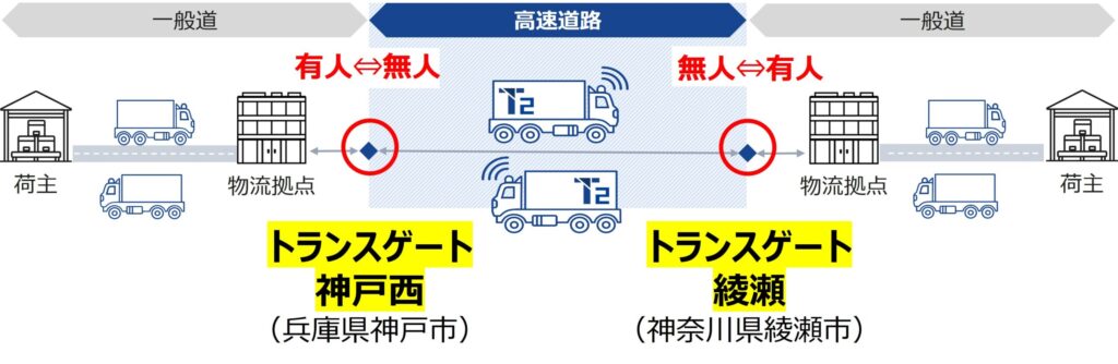 今回設置されたトランスゲートは、関東と関西を結ぶ輸送を見据えて、神奈川県綾瀬市と兵庫県神戸市の2か所に用意されています。いずれも高速道路のインターチェンジのすぐ近くに位置しており、効率よく自動運転と有人運転を切り替えられるよう設計されています。