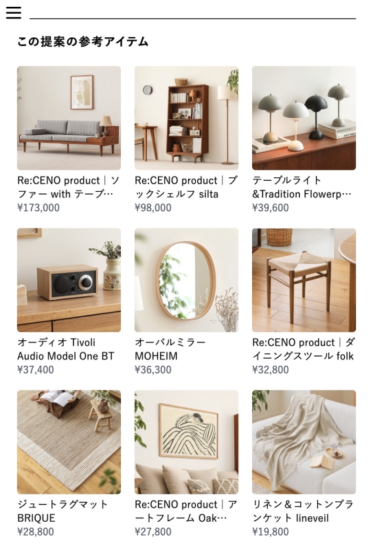 今回のアップデートで大きく変わったのが、この“最後の一歩”です。AIが提案したコーディネートの中に、実際に購入できる家具やインテリアがそのまま反映されるようになり、気になったアイテムをワンタップで確認・購入できる仕組みが整いました。