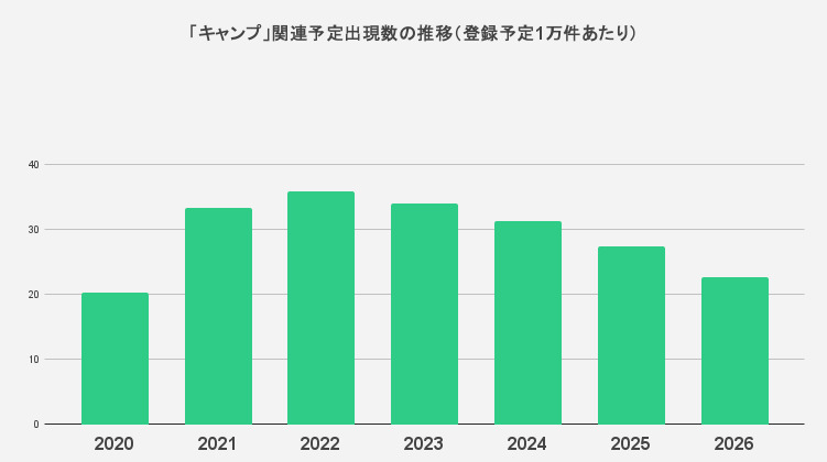今回のデータでは、アウトドア人気が一様に続いているわけではないこともうかがえました。まず注目されるのが、「キャンプ」関連予定の動きです。全体推移を見ると、2022年をピークに予定登録数は減少傾向にあり、2026年にかけて緩やかに低下している様子が見て取れます。コロナ禍では密を避けられるレジャーとして注目を集めたキャンプですが、その盛り上がりには変化も出てきているようです。