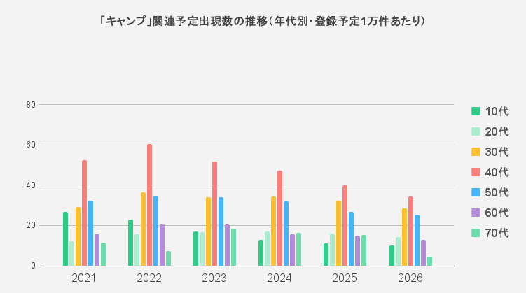 年代別の推移を見ても、その傾向はうかがえます。特定の世代だけではなく、各年代で予定数が下がる動きが見られており、全体として以前ほどの勢いではなくなっていることが感じられます。準備や移動の負担、気候条件なども含め、楽しみ方の選択に変化が出てきているのかもしれません。