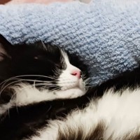 猫ちゃんがお腹を舐めて毛が抜けてしまったため、服を着せてあげることに。しかし、服を着た猫ちゃんは予想外すぎる姿になってしまったようで…?