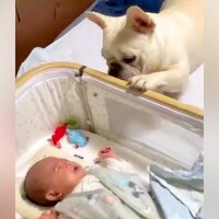 ワンコに来客用のベッドの上からどいてもらいたくて、抱っこして起き上がらせてみたら…?可愛くて面白い行動が話題です。